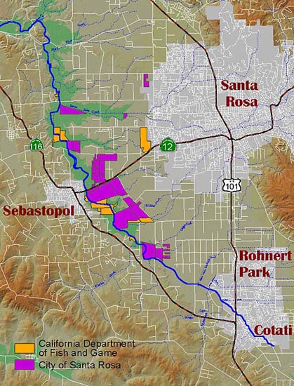 A portion of the Laguna is under government ownership. This map shows the holdings of the City of Santa Rosa and Department of Fish and Wildlife in the Laguna.